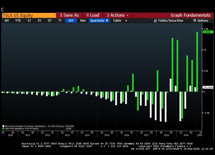 Figure 3. Quarterly net income (white) and operating cash flow (green) over time. Source: Bloomberg Terminal.