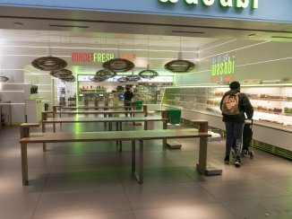 A shopper roams the Wasabi Store in Penn Station in New York on Monday. Food businesses are being urged to serve only take-out orders to reduce the spread of the novel coronavirus.